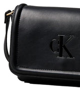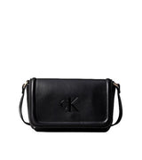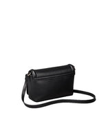 Borsa a tracolla donna nera in ecopelle liscia, con tracolla incrociata regolabile, chiusura con aletta magnetica, tre tasche interne per carte di credito, monogramma stampato sul davanti.