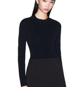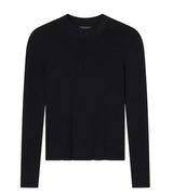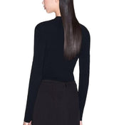 Maglia donna nera realizzata in misto viscosa, lavorata a coste verticali per un effetto modellante sul busto. Modello dallo scollo rotondo, maniche lunghe, lunghezza rogolare ai fianchi, dalla vestibilità aderente, con discreto logo in rilievo sul retro del collo.