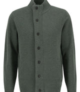 Cardigan uomo color oliva, a maglia grossa è realizzato in pura lana d'agnello e presenta toppe in alcantara sui gomiti e un ricamo personalizzato sul petto. La vestibilità classica rende questo capo facile da sovrapporre a camicie e T-shirt.