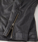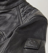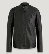 Giacca V Racer nera modello uomo dal taglio slim, in pelle di agnello cheviot, idrorepellente, rinforzo con cuciture parallele sulle spalle, colletto con bottone a pressione, tasche inferiori con chiusura zip, mostrina in tessuto con la fenice sulla manica sinistra. Disponibile dalla taglia 46 alla 56.
