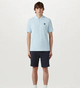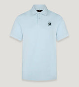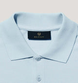 Polo uomo celeste in piquè di cotone testurizzato, dal taglio classico a maniche corte con bordo elasticizzato, colletto a costine, chiusura a due bottoni e patch della fenice con bordo ricamato sul petto. Vestibilità regolare.