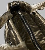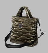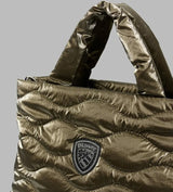 Borsa donna bronzo, modello shopper in nylon laminatocon trapuntatura a onde tipica dei piumini. Lo scudo con strass e micro borchie la impreziosisce rendendola unica. Presenta una tracolla staccabile. Dimensioni: 20x27.5x13 cm.