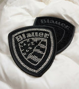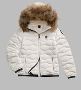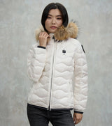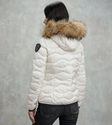 Giubbino donna bianco, in nylon idrorepellente con trapuntatura a onde orizzonatli e bordo cappuccio in vera piuma. Presenta chiusura con zip nascosta, copricerniera al collo, tasche con zip, elastico a costine sul fondo e polsini, patch glitter con logo.