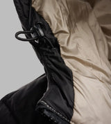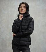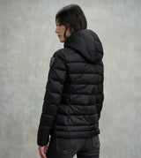 Giubbino donna nero in nylon lucido, idrorepellente a righe orizzontali trapuntate, con imbottitura leggera, caldo e poco ingombrante, con un taglio che asalta il punto vita. Caratterizzato da cappuccio fisso con coulisse, foderato a contrasto, chiusura con zip nascosta , para-zip al collo, tasche con zip patch glitterato con logo.