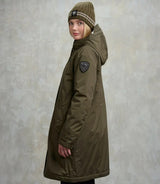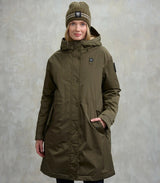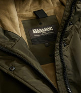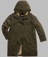 Parka lungo donna verde bosco in nylon liscio leggero e idrorepellente con cappuccio fisso, foderato in morbida eco-pelliccia in colore a contrasto. Modello con coulisse in vita, con cappuccio fisso con visiera, chiusura con zip e bottoni automatici, tasche interne con velcro e patch con logo.