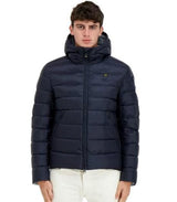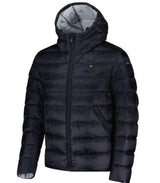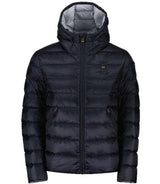 Giubbino uomo blu realizzato in nylon idrorepellente, caratterizzato da cappuccio fisso con coulisse, chiusura zip nascosta, copri cursore sul collo, tasche con zip nascosta, coulisse sul fondo, patch e passante con logo, con imbottitura in piuma.
