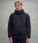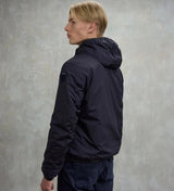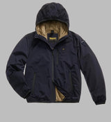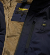 Giubbino uomo blu liscio esternamente ma con pelliccia ecologica morbida e calda all’interno. Tessuto idrorepellente con cuciture interne nastrate thermofix. Capo per chi vuole rimanere coccolato anche nelle giornate piovose. Modello che presenta cappuccio fisso, chiusura con zip spalmata in contrasto colore, elastico rigato sul bordo del cappuccio, del fondo e della manica, tasche con zip spalmata, tasche interne e patch con logo.
