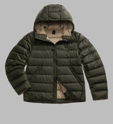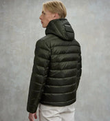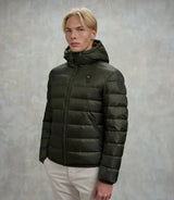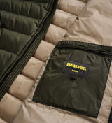 Giubbino uomo idrorepellente color tiglio trapuntato a righe orizzontali. Capo iconico Blauer con imbottitura naturale in piuma, calda e non ingombrante. Caratterizzato da cappuccio fisso con coulisse, foderato in contrasto di colore, chiusura zip nascosta, tasche con zip nascosta, coulisse sul fondo, tasca interna, patch con logo.