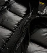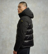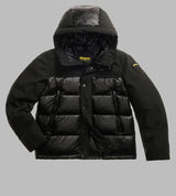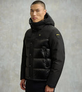 Giubbino uomo nero, idrorepellente con neoprene leggero e liscio in tono e corpo in nylon impunturato a righe. Imbottitura naturale in piuma, calda e non ingombrante che unisce comodità ed eleganza. Presenta cappuccio fisso con coulisse doppia, chiusura zip nascosta da pattina e bottoni automatici, tasche grandi con zip, fondo manica doppio con elastico interno, tasche interne con velcro e patch con logo.