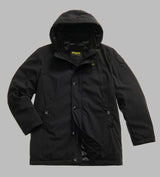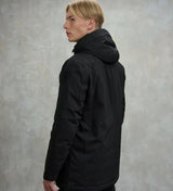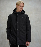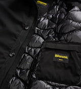 Parka lungo uomo nero in neoprene liscio idrorepellente con collo alto removibile tramite zip. Imbottitura in piuma naturale calda ma non ingombrante. Capo iconico Blauer ad inspirazione militare. Presenta chiusura con zip e bottoni a chiodo, tasche con bottone, tasche interne con velcro e patch con logo.