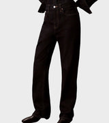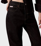 Jeans donna lavaggio scuro in denim di cotone. Modello bootcut dritto, a vita alta, cinque tasche.