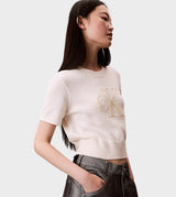 Maglia donna bianca realizzata in cotone, modello corto dal taglio regolare, girocollo, maniche corte e finitura a costine con grafica monologo sul davanti.