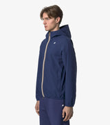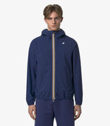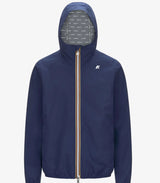 Giubbino blu cobalto corto da uomo, ideale per le mezze stagioni e con vestibilità slim, realizzata in tessuto tecnico elasticizzato, impermeabile, antivento e traspirante. L'interno è foderato con una membrana isolante decorata con lettering K-Way stampato all over in tonalità argento. Le tasche laterali con zip, il cappuccio avvolgente e regolabile, i polsini e i bordi con inserti elastici sono dettagli funzionali che garantiscono aderenza e una vestibilità comoda e veloce. Logo stampato bianco.