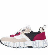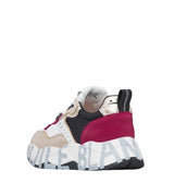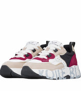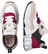 Sneakers donna in suede beige chiaro e tessuto bianco, con inserti in pelle e dettagli in rosso rubino, chiusura con lacci, suola alta in gomma con logo serigrafato sul fondo.