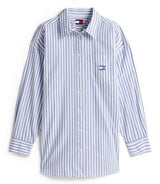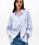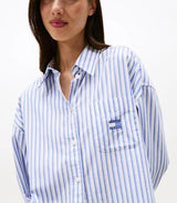 Camicia donna a righe azzurra e bianca, manica lunga, chiusura con bottoni e bamdierina logo applicata sulla tasca sul petto. Vestibilità morbida.
