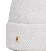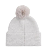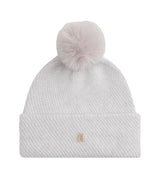Cappello donna grigio chiaro in misto lana, con finitura a coste all over, con il pompon e fili metallizzati intrecciati, bordo risvoltato e placchetta monogramma sul bordo.