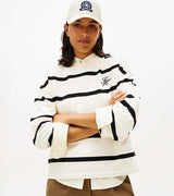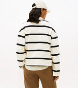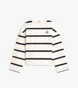 Felpa donna avorio con righe nere, realizzata in spugna di misto cotone, vestibilità regolare e spalle scese con logo in corsivo ricamato sul petto.