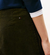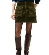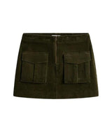 Gonna corta donna verde in velluto a coste di cotone stretch con tasche cargo sul davanti e chiusura zip a vista , bandierina logo ricamata sul retro.