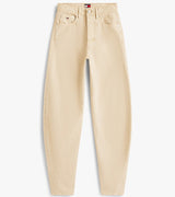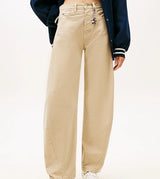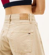 Pantalone donna beige in puro cotone, con vita media e gambe larghe a botte, chiusura con cerniera e bottone, stile cinque tasche.
