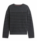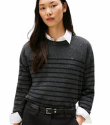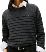 Pullover donna grigio in morbida lana, con spalle scese e taglio comodo, collo e polsini arrotolati, fondo in maglia a coste, nastro iconico all'interno del collo, bandierina ricamata sul petto.