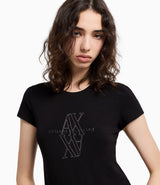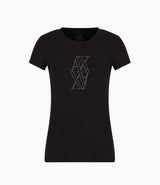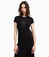 T-shirt donna nera slim fit in jersey di cotone stretch, pensata per offrire comfort e una vestibilità aderente. Il design è arricchito da ricamo e stampa con logo sul davanti, mentre lo scollo tondo e le maniche corte completano uno stile moderno e distintivo.