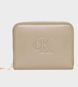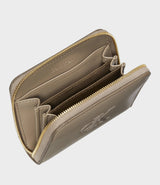 Portafoglio donna beige realizzato in ecopelle, con chiusura zip e scomparti interni per carte, logo monogramma sul davanti.
