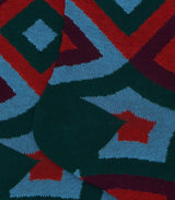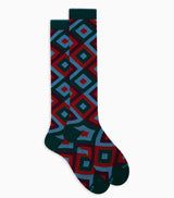 Calze lunghe da uomo in morbido cotone color verde, decorate con un'elegante fantasia a rombi concentrici. Un accessorio distintivo che unisce comfort e originalità.