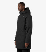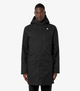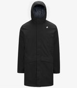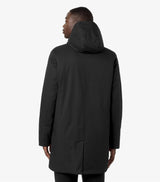 Giubbino lunghezza tre quarti da uomo nero realizzato in twill di poliestereimpermeabile, idrorepellente e antivento, con imbottitura in ovatta peso leggero, che offre un grado di calore medio perfetto per i primi freddi. Modello dotato di cappuccio nokn staccabile regolabile con corda elastica, chiusura con zip coperta dalla patta,  polsini con ghetta interna, due tasche scalda-mani sul petto, due tasche con patta e chiusura con snap, logo in silicone bianco. Vestibilità regolare.