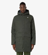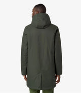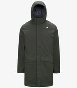 Giubbino lunghezza tre quarti da uomo verde realizzato in twill di poliestereimpermeabile, idrorepellente e antivento, con imbottitura in ovatta peso leggero, che offre un grado di calore medio perfetto per i primi freddi. Modello dotato di cappuccio nokn staccabile regolabile con corda elastica, chiusura con zip coperta dalla patta,  polsini con ghetta interna, due tasche scalda-mani sul petto, due tasche con patta e chiusura con snap, logo in silicone bianco. Vestibilità regolare.