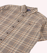 Camicia uomo beige a quadri realizzata in 100% cotone biologico, in un tessuto stropicciato tipo crepe