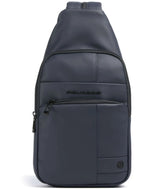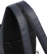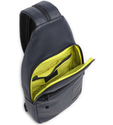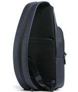 Zaino monospalla blu realizzato in poliuretano con fodera logata in poliestere. Presenta una tasca frontale con zip, una tasca con zip sul retro, sistema dorsale a contatto con il corpo, imbottito e traspirante, finiture in metallo, internamente è dotato di supporto per penna e due tasche interne oltre allo scomparto principale. Dimensione: ca. 22 x 38 x 7 cm (larghezza x altezza x profondità)