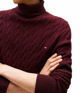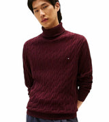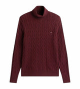 Maglia uomo burgundy realizzata in puro cotone pettinato, caratterizzata da lavorazione a maglia intrecciata, collo dolcevita, collo, polsini e fondo a coste con bandierina ricamata sul petto. Vestibilità regolare con spalle leggermente scese.