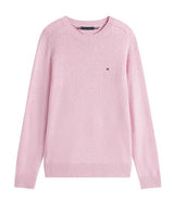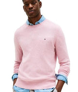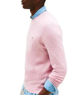 Maglia uomo rosa realizzata in pura lana, modello girocollo, con collo, polsini e orlo a coste, bandierina ricamata sul petto. Vestibilità regolare.