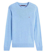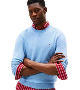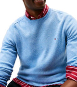 Pullover uomo azzurro realizzato in pura lana di agnello per donare una sensazione di comfort impareggiabile, è rifinito dalla bandierina ricamata.