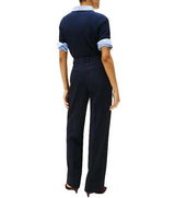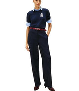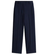 Pantaloni donna blu scuro realizzati in misto viscosa stretch, leggeri e dal taglio dritto, caratterizzati da chiusura con zip e gancio, pieghe stirate e due tasche a filetto sul retro, bandierina logo in metallo sul retro. Vestibilità slim.