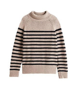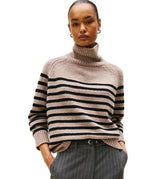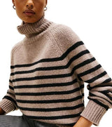 Pullover donna beige a strisce nere realizzato in misto lana e cashmere, in maglia grossa con collo dolcevita, monogramma logo tono su tono sul retro. Modello dalla vestibilità rilassata con maniche reglan.