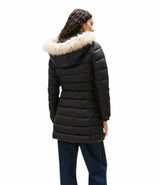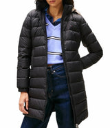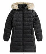 Piumino donna lungo nero con finitura lucida e pelliccia sintetica rimovibile sul cappuccio, ideale per le giornate più ventose. Caratterizzato da finitura idrorepellente e imbottitura in piuma, collo a listino, zip integrale, due tasche ad angolo aperte in vita, polsini elastici e bandierina ricamata sul petto. Vestibilità slim.
