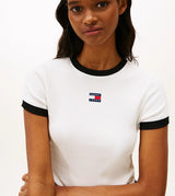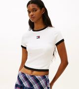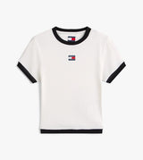 T-shirt donna ecrù in cotone stretch con texture a coste e finiture a contrasto, logo sul petto e vestibilità slim.