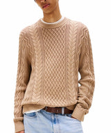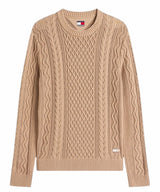 Pullover uomo beige con la classica lavorazione a maglia intrecciata e il taglio slim, è un capo intramontabile e di grande impatto. Realizzato in puro cotone, girocollo, con collo, polsini e fondo a coste, distintivo Tommy tono su tono sul fondo.