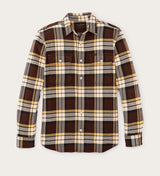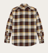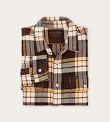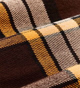 Camicia uomo a quadri marrone/giallo in caldo cotone e interno in morbido twill spazzolato, dal taglio leggermente aderente, chiusura con bottoni in melammina di tipo militare e polsini regolabili con bottoni.
