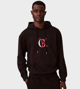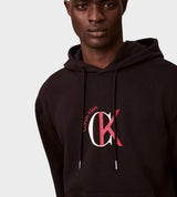 Felpa uomo nera in cotone, modello con cappuccio con coulisse e tasca a marsupio, logo frontale a contrasto, vestibilità regolare.