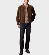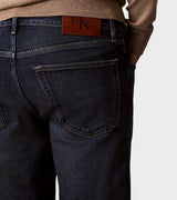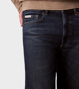 Jeans uomo lavaggio scuro in denim di cotone, modello vita media e gamba dritta.