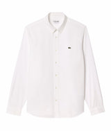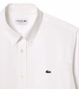 Camicia uomo bianca in cotone pinpoint di alta qualità, tessuto con filo super sottile, caratterizzata da linee pure e pulite e da un tessuto in cotone di alta qualità, un tessuto lussuoso e leggero. Il taglio dritto e i dettagli di due pieghe creano una sensazione unica. Presenta colletto corto con bottoni, bottoni in vera madreperla e coccodrillo ricamato sul petto.