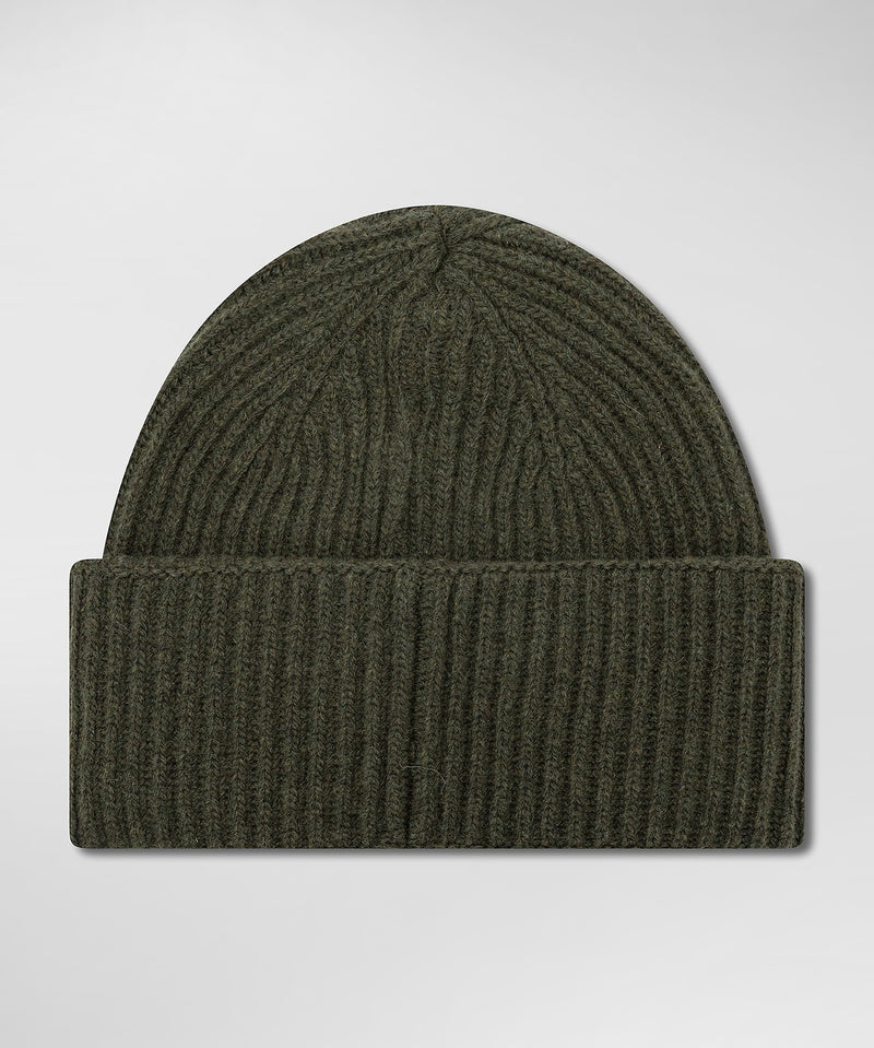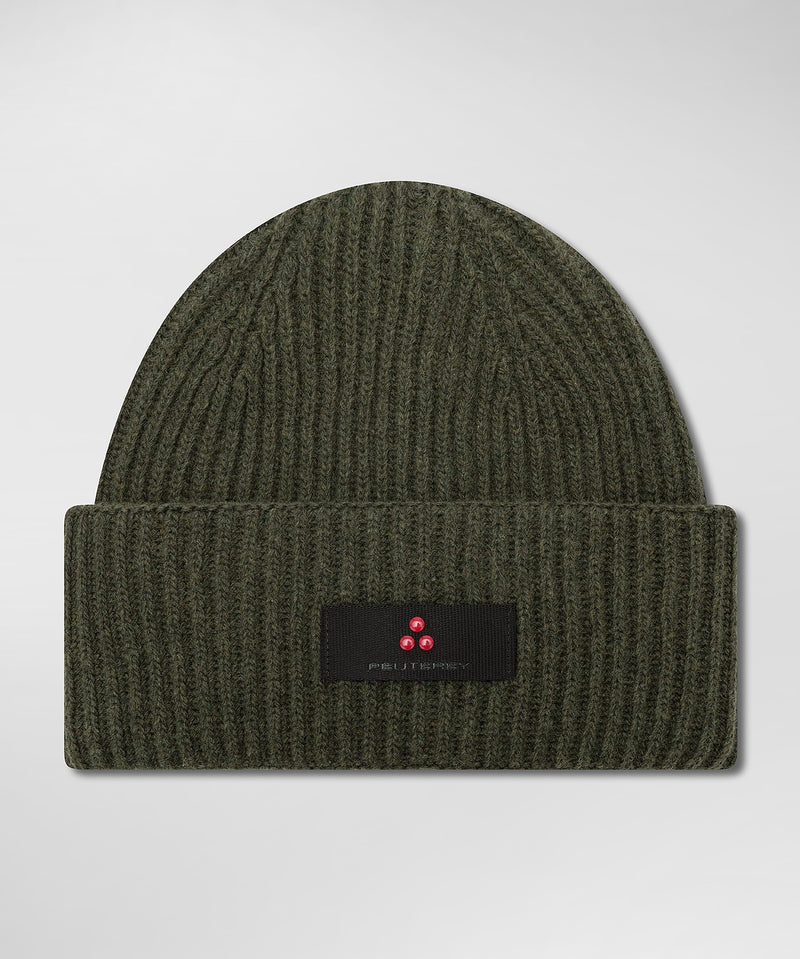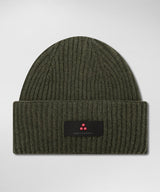 Cappello uomo verde fogliame in misto cashmere, con lavorazione a coste e risvolto, proposto in tinta unita. Disponibile in taglia unica. La personalizzazione con iconico logo Peuterey trilogy applicata sul davanti aggiunge un tocco distintivo. Un accessorio irrinunciabile per le giornate più fredde, perfetto da indossare ogni giorno o da regalare.