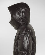 Giubbino uomo nero con maxi trapunte, realizzato in nylon lakkè lucido, lavorato con speciali trattamenti termici che ne esaltano la brillantezza e conferiscono una mano fluida e morbida. Il cappuccio, con bottoni a pressione, richiama la forma di una balaclava e garantisce massima protezione quando completamente chiuso: un dettaglio bold, perfetto per affrontare la città con personalità. La zip nera centrale è coperta da patta, mentre la coulisse in vita e il maxi logo tondo sul petto aggiungono un tocco street. L’imbottitura in piuma naturale certificata offre calore e leggerezza, mentre il tessuto è wind resistant e water repellent con trattamento PFC Free, per affrontare ogni clima con sicurezza. Parte della capsule AI25 Peuterey Plurals x Tony Effe, questo capo unisce lo stile urban e provocatorio dell’artista romano con il know-how tecnico e l’estetica contemporary outdoor del brand. Una collaborazione esclusiva, per un guardaroba dal carattere forte e riconoscibile.