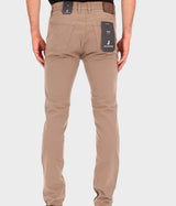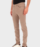 Pantalone uomo beige scuro modello John slim fit realizzato in gabardine di cotone stretch. Zip e bottone di chiusura. Cinque tasche con mini logo ricamato sul taschino. Iconiche toppe Jeckerson tono su tono.